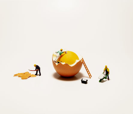 Miniature figures interact with the egg as if engaged in grand worksites, transforming the ordinary into visual poetry.