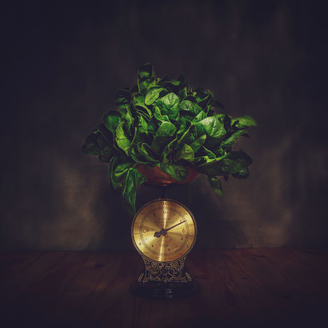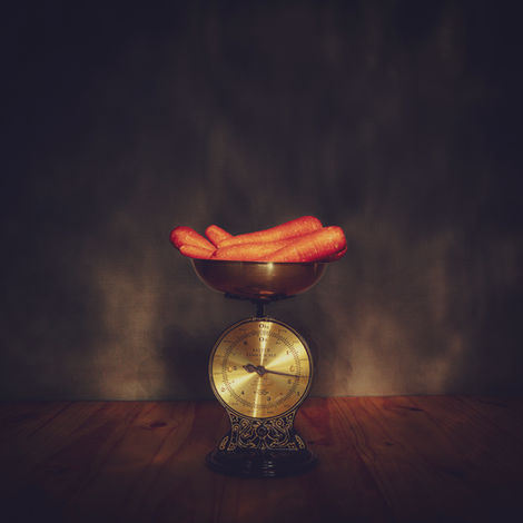 Vegetais transformados em esculturas visuais sobre uma balança antiga.